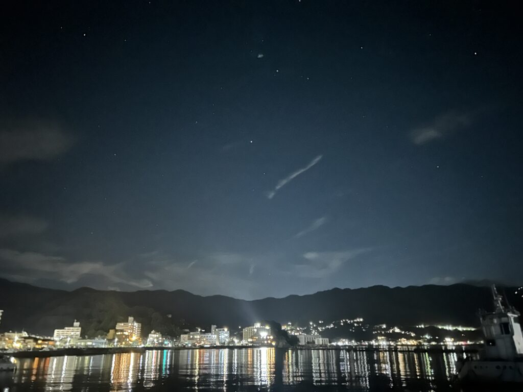 網代の港の向こうを見ると、そこには熱海市街地です。夜は熱海市街の街の灯りが輝き、穏やかな海面がその明かりを映しています。息を呑むほど美しい夜景を静かな港で堪能してください。