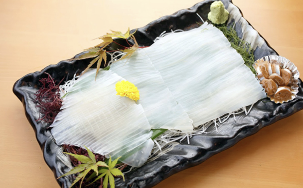 網代港で獲れた新鮮な魚介類を提供する食事処。その店その店の特徴あるメニューをお楽しみください。(写真は「笑魚」の “活イカ刺” )